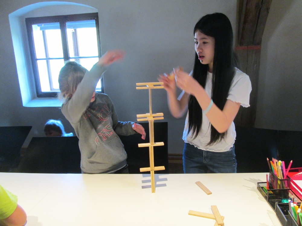 V první části se žáci v nejvyšším patře zrekonstruované budovy bývalého pivovaru potrápili s problémem, jak nejlépe postavit pořádnou pevnou zeď. Postupně pokusy s dřevěnou stavebnicí objasnili, co znamená vázané zdivo, jak se nechá zpevnit konstrukce, kolik unesou sloupy ve tvaru dutých válců, jak je možné využít skelet při stavbě výškového domu a žáci „objevovali“ různé další vychytávky z oboru stavitelství. Po svačině jsme se přesunuli do řemeslné dílny. Zde si všichni vyrobili z barevných střípků obkladaček mozaiková zrcadla a obrázky, které podle pokynů pana lektora dokončili ve škole.