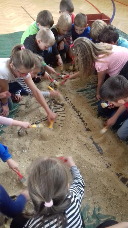 V pátek 15. 11. 2019 se děti ze školní družiny účastnily interaktivní přenášky o vývoji života na Zemi. Měly možnost osahat si reálné fosilie trilobitů, dinosauřích zubů, mamutích stoliček či zkameněliny přesliček. Děti se na krátký okamžit staly paleontology a odkrývaly kostru dinosaura a také měly možnost zhotovit si sádrový model vyhynulých živočichů.